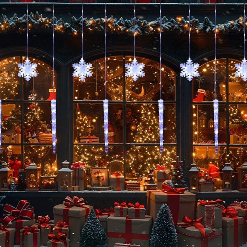 The 'Christmas Atmosphere Snowflake Decorative Lamp' features elegant snowflake-shaped lights with vertical icicle strands, each embedded with energy-efficient LED bulbs. Offering warm white, cool white, and colorful blinking modes, it's perfect for adding a festive touch to any holiday setting with easy installation and versatile display options.