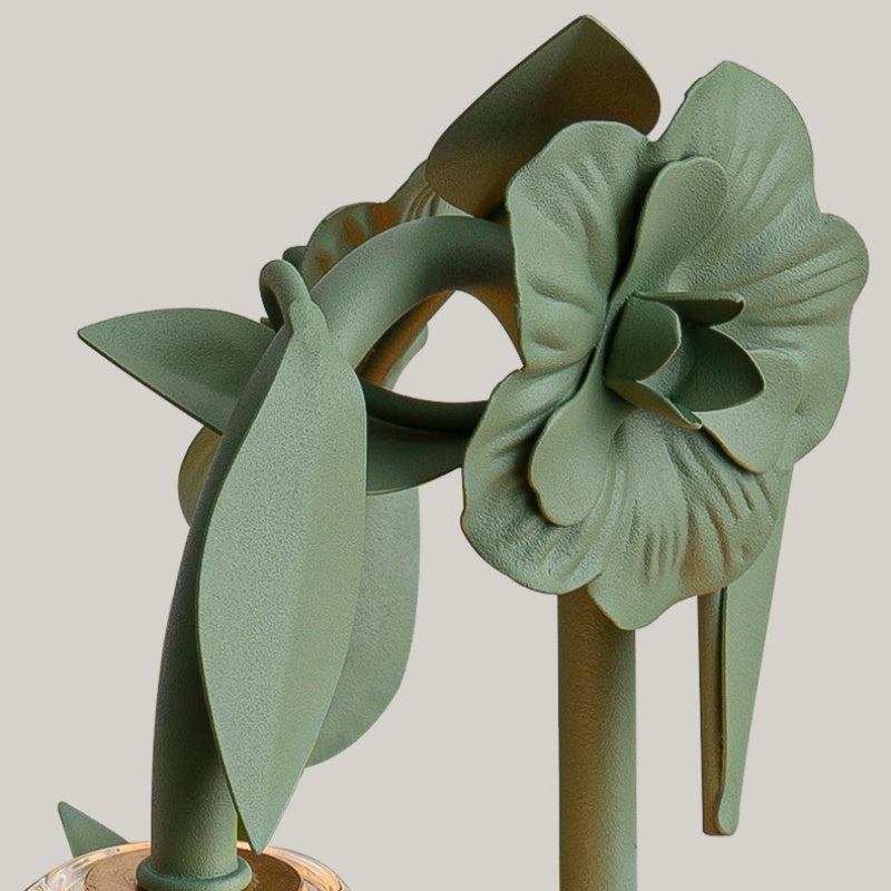 The lamp features a delicate, translucent bell-shaped glass shade that mimics the graceful petals of a lily, suspended beneath a meticulously sculpted metal lily bloom and leaves in a soft, muted green. When lit, the bulb within the glass shade emits a warm, inviting glow that gently heats the wax melt, releasing fragrance into the surrounding space. This charming lamp serves as both a source of soft illumination and a subtle aromatherapy diffuser, making it a delightful addition to any room.